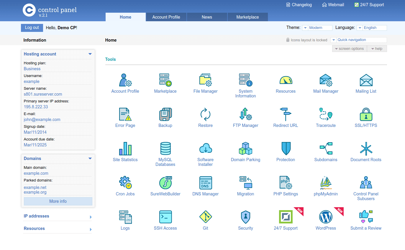 El panel de control le permite administrar fácilmente archivos, cuentas de correo electrónico, copias de seguridad, WordPress, configuración de DNS y monitorear el uso de sus recursos.